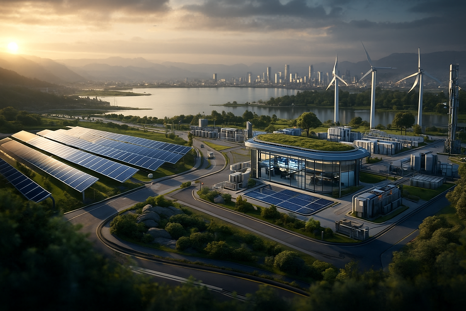 Panel surya dan turbin angin diatur oleh sistem AI sebagai ilustrasi otomatisasi energi terbarukan.