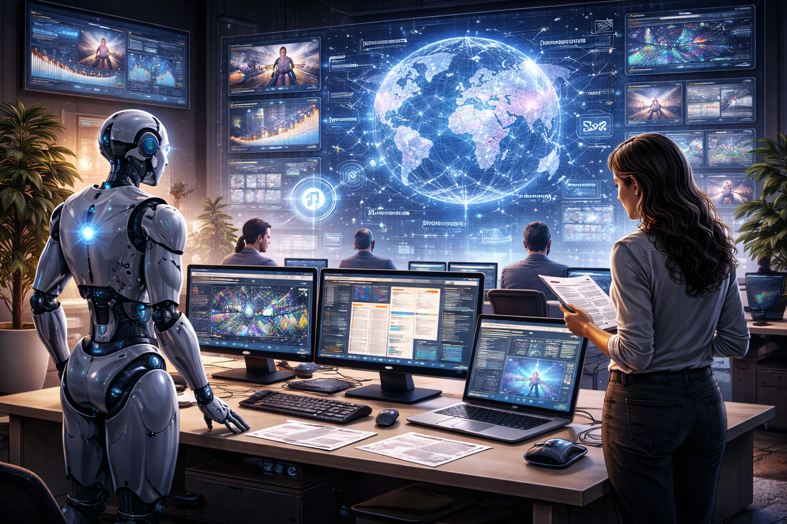 Ilustrasi ruang redaksi digital dengan teknologi AI dan layar data berita global